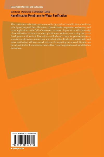 This book covers the basic and sustainable approach of nanofiltration membrane techniques along with their fabrication, characterization, separation mechanisms, and broad applications in the field of wastewater treatment. It provides a wide knowledge of nanofiltration technique to water purification audience concerning the recent development with various illustrations, methods and results for graduate students, scientists, academicians, researchers, and industrialists. Readers from wastewater and water purification will have a quick reference by exploring the research literature on the subject field with commercial value-added research applications of nanofiltration membrane.