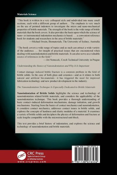 Understanding the Basics of Nanoindentation and Why It Is Important Contact damage induced brittle fracture is a common problem in the field of brittle solids. In the case of both glass and ceramics-and as it relates to both natural and artificial bio-materials-it has triggered the need for improved fabrication technology and new product development in the industry. The Nanoindentation Technique Is Especially Dedicated to Brittle Materials Nanoindentation of Brittle Solids highlights the science and technology of nanoindentation related to brittle materials, and considers the applicability of the nanoindentation technique. This book provides a thorough understanding of basic contact induced deformation mechanisms, damage initiation, and growth mechanisms. Starting from the basics of contact mechanics and nanoindentation, it considers contact mechanics, addresses contact issues in brittle solids, and explores the concepts of hardness and elastic modulus of a material. It examines a variety of brittle solids and deciphers the physics of deformation and fracture at scale lengths compatible with the microstructural unit block. Discusses nanoindentation data analysis methods and various nanoindentation techniques Includes nanoindentation results from the authors' recent research on natural biomaterials like tooth, bone, and fish scale materials Considers the nanoindentation response if contact is made too quickly in glass Explores energy issues related to the nanoindentation of glass Describes the nanoindentation response of a coarse grain alumina Examines nanoindentation on microplasma sprayed hydroxyapatite coatings Nanoindentation of Brittle Solids provides a brief history of indentation, and explores the science and technology of nanoindentation related to brittle materials. It also offers an in-depth discussion of indentation size effect; the evolution of shear induced deformation during indentation and scratches, and includes a collection of related research works.