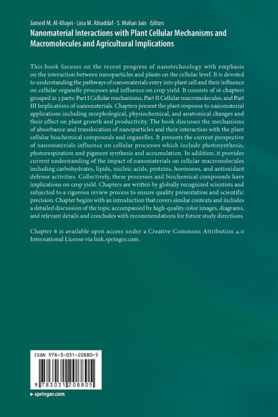This book focuses on the recent progress of nanotechnology with emphasis on the interaction between nanoparticles and plants on the cellular level. It is devoted to understanding the pathways of nanomaterials entry into plant cell and their influence on cellular organelle processes and influence on crop yield. It consists of 16 chapters grouped in 3 parts: Part I Cellular mechanisms, Part II Cellular macromolecules, and Part III Implications of nanomaterials. Chapters present the plant response to nanomaterial applications including morphological, physiochemical, and anatomical changes and their effect on plant growth and productivity. The book discusses the mechanisms of absorbance and translocation of nanoparticles and their interaction with the plant cellular biochemical compounds and organelles. It presents the current perspective of nanomaterials influence on cellular processes which include photosynthesis, photorespiration and pigment synthesis and accumulation. In addition, it provides current understanding of the impact of nanomaterials on cellular macromolecules including carbohydrates, lipids, nucleic acids, proteins, hormones, and antioxidant defense activities. Collectively, these processes and biochemical compounds have implications on crop yield. Chapters are written by globally recognized scientists and subjected to a rigorous review process to ensure quality presentation and scientific precision. Chapter begins with an introduction that covers similar contexts and includes a detailed discussion of the topic accompanied by high-quality color images, diagrams, and relevant details and concludes with recommendations for future study directions.
