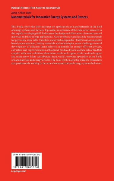 This book covers the latest research on applications of nanomaterials in the field of energy systems and devices. It provides an overview of the state-of-art research in this rapidly developing field. It discusses the design and fabrication of nanostructured materials and their energy applications. Various topics covered include nanomaterials for perovskite solar cells, transition metal dichalcogenides (TMDs) nanocomposites based supercapacitors, battery materials and technologies, major challenges toward development of efficient thermoelectric materials for energy efficient devices, extraction and experimentation of biodiesel produced from leachate oils of landfills coupled with nano-additives aluminium oxide and copper oxide on diesel engine and many more. It has contributions from world-renowned specialists in the fields of nanomaterials and energy devices. The book will be useful for students, researchers and professionals working in the area of nanomaterials and energy systems & devices.