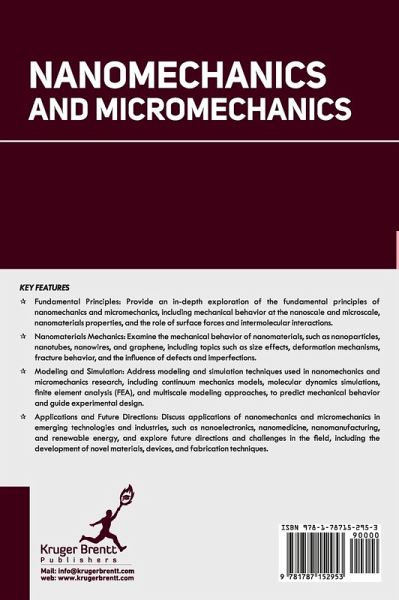 Fundamental Principles: Provide an in-depth exploration of the fundamental principles of nanomechanics and micromechanics, including mechanical behavior at the nanoscale and microscale, nanomaterials properties, and the role of surface forces and intermolecular interactions. Nanomaterials Mechanics: Examine the mechanical behavior of nanomaterials, such as nanoparticles, nanotubes, nanowires, and graphene, including topics such as size effects, deformation mechanisms, fracture behavior, and the influence of defects and imperfections. Modeling and Simulation: Address modeling and simulation techniques used in nanomechanics and micromechanics research, including continuum mechanics models, molecular dynamics simulations, finite element analysis (FEA), and multiscale modeling approaches, to predict mechanical behavior and guide experimental design. Applications and Future Directions: Discuss applications of nanomechanics and micromechanics in emerging technologies and industries, such as nanoelectronics, nanomedicine, nanomanufacturing, and renewable energy, and explore future directions and challenges in the field, including the development of novel materials, devices, and fabrication techniques.