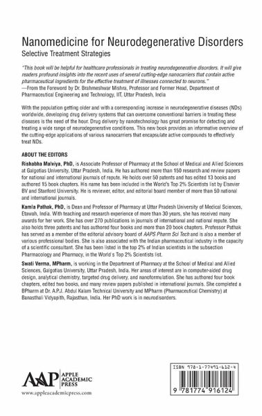 Rishabha Malviya, PhD, is Associate Professor of Pharmacy at the School of Medical and Allied Sciences at Galgotias University, Uttar Pradesh, India. He has authored more than 150 research and review papers for national and international journals of repute. He holds over 50 patents and has edited 13 books and authored 15 book chapters. His name has been included in the World's Top 2% Scientists list by Elsevier BV and Stanford University. He is reviewer, editor, and editorial board member of more than 50 national and international journals. Kamla Pathak, PhD, is Dean and Professor of Pharmacy at Uttar Pradesh University of Medical Sciences, Etawah, India. With teaching and research experience of more than 30 years, she has received many awards for her work. She has over 270 publications in journals of international and national repute. She also holds three patents and has authored four books and more than 20 book chapters. Professor Pathak has served as a member of the editorial advisory board of AAPS Pharm Sci Tech and is also a member of various professional bodies. She is also associated with the Indian pharmaceutical industry in the capacity of a scientific consultant. She has been listed in the top 2% of Indian scientists of the subsection Pharmacology and Pharmacy, in the World's Top 2% Scientists list. Swati Verma, MPharm, is working in the Department of Pharmacy at the School of Medical and Allied Sciences, Galgotias University, Uttar Pradesh, India. Her areas of interest are in computer-aided drug design, analytical chemistry, targeted drug delivery, and nanoformulation. She has authored four book chapters, edited two books, and many review papers published in international journals. She completed a BPharm at Dr. A.P.J. Abdul Kalam Technical University and MPharm (Pharmaceutical Chemistry) at Banasthali Vidyapith, Rajasthan, India. Her PhD work is in neurodisorders.