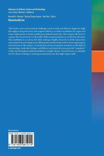 1 Nanomedicine: working towards defining the field.- 2 Complement regulators and inhibitors in health and disease: A structural perspective.- 3 The art of complement: complement sensing of nanoparticles and consequences.- 4 The nanoscience of polyvalent binding by proteins in the immune response .- 5 Microfluidics-based Single Cell Analytical Platforms for Characterization of Cancer.- 6 Nanotheranostics and in-vivo imaging.- 7 Targeting cancer using nanocarriers.- 8 The importance of particle geometry in design of therapeutic and imaging nanovectors.- 9 Delivery of peptides and proteins to the brain using nano-drug delivery systems and other formulations.- 10 Polymer-based DNA delivery systems for cancer immunotherapy.- 11 The use of silk in nanomedicine applications.- 12 Nanotoxicology and regulatory affairs.- 13 The application of nanotechnology for implant drug release.- 14 Guided cellular responses by surface cues for nanomedicine applications
