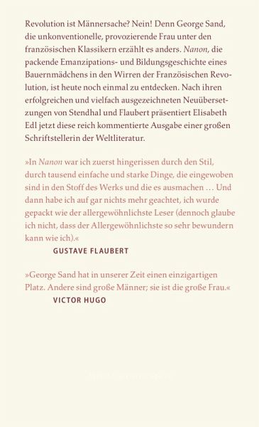 George Sand über die Französische Revolution aus der Perspektive eines Bauernmädchens - eine der ersten engagierten Autorinnen der Weltliteratur in neuer ÜbersetzungRevolution ist Männersache? Nein! Denn George Sand, die unkonventionelle, provozierende Frau unter den französischen Klassikern, erzählt es anders: Nanon ist vierzehn, als 1789 die Revolution losbricht und alle Stände niederreißt. Das Bauernmädchen, eine Leibeigene, wird Zeugin und Akteurin in einem der größten Umbrüche der Geschichte. Als Mädchen noch Analphabetin, schreibt Nanon im Alter ihr Leben auf: die packende Emanzipations- und Bildungsgeschichte einer Frau in einem männlich geprägten Jahrhundert. Neben ihren vielfach ausgezeichneten Neuübersetzungen von Stendhal und Flaubert präsentiert Elisabeth Edl jetzt diese reich kommentierte Ausgabe einer der großen Schriftstellerinnen der Weltliteratur.