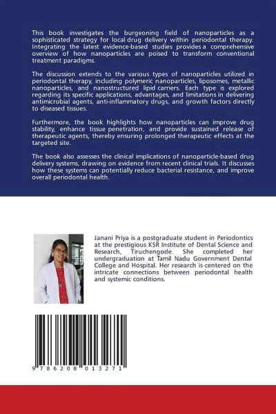 This book investigates the burgeoning field of nanoparticles as a sophisticated strategy for local drug delivery within periodontal therapy. Integrating the latest evidence-based studies provides a comprehensive overview of how nanoparticles are poised to transform conventional treatment paradigms. The discussion extends to the various types of nanoparticles utilized in periodontal therapy, including polymeric nanoparticles, liposomes, metallic nanoparticles, and nanostructured lipid carriers. Each type is explored regarding its specific applications, advantages, and limitations in delivering antimicrobial agents, anti-inflammatory drugs, and growth factors directly to diseased tissues. Furthermore, the book highlights how nanoparticles can improve drug stability, enhance tissue penetration, and provide sustained release of therapeutic agents, thereby ensuring prolonged therapeutic effects at the targeted site. The book also assesses the clinical implications of nanoparticle-based drug delivery systems, drawing on evidence from recent clinical trials. It discusses how these systems can potentially reduce bacterial resistance, and improve overall periodontal health.