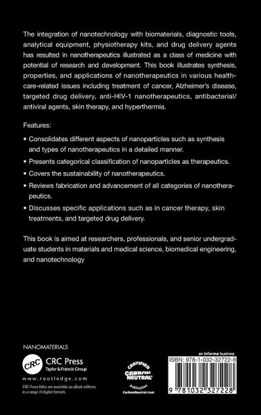 This book illustrates synthesis, properties, and applications of nanotherapeutics in various health care related issues including treatment of cancer, Alzheimer's disease, targeted drug delivery, Anti-HIV-1 nanotherapeutics, antibacterial/antiviral agents, skin therapy and hyperthermia.