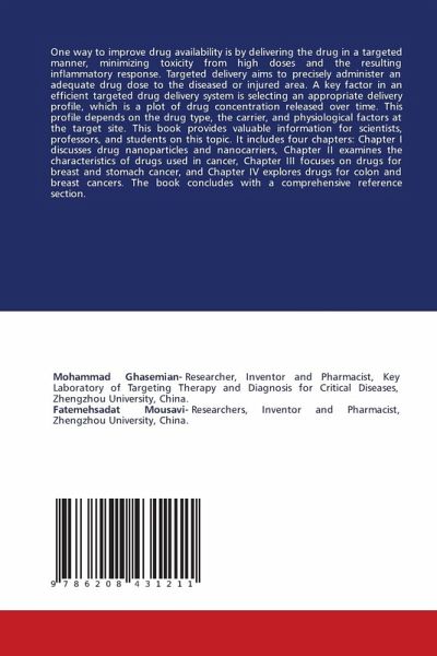 One way to improve drug availability is by delivering the drug in a targeted manner, minimizing toxicity from high doses and the resulting inflammatory response. Targeted delivery aims to precisely administer an adequate drug dose to the diseased or injured area. A key factor in an efficient targeted drug delivery system is selecting an appropriate delivery profile, which is a plot of drug concentration released over time. This profile depends on the drug type, the carrier, and physiological factors at the target site. This book provides valuable information for scientists, professors, and students on this topic. It includes four chapters: Chapter I discusses drug nanoparticles and nanocarriers, Chapter II examines the characteristics of drugs used in cancer, Chapter III focuses on drugs for breast and stomach cancer, and Chapter IV explores drugs for colon and breast cancers. The book concludes with a comprehensive reference section.