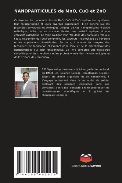 Ce livre sur les nanoparticules de MnO, CuO et ZnO explore leur synthèse, leur caractérisation et leurs diverses applications. Il se penche sur les propriétés physiques et chimiques uniques de ces nanoparticules d'oxyde métallique, telles qu'une surface élevée, une activité optique et une efficacité catalytique. Le texte souligne leur rôle dans des domaines tels que l'assainissement de l'environnement, les capteurs, le stockage de l'énergie et les applications biomédicales. En outre, il aborde les progrès des techniques de fabrication et l'impact de la taille et de la morphologie des nanoparticules sur leur fonctionnalité. Ce livre constitue une ressource complète pour les chercheurs et les professionnels des nanotechnologies et de la science des matériaux.