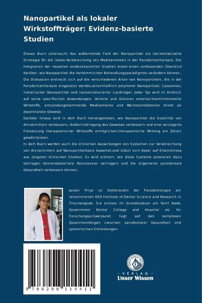 Dieses Buch untersucht das aufkeimende Feld der Nanopartikel als hochentwickelte Strategie für die lokale Verabreichung von Medikamenten in der Parodontaltherapie. Die Integration der neuesten evidenzbasierten Studien bietet einen umfassenden Überblick darüber, wie Nanopartikel die herkömmlichen Behandlungsparadigmen verändern können . Die Diskussion erstreckt sich auf die verschiedenen Arten von Nanopartikeln, die in der Parodontaltherapie eingesetzt werden,einschließlich polymerer Nanopartikel, Liposomen, metallischer Nanopartikel und nanostrukturierter Lipidträger. Jeder Typ wird im Hinblick auf seine spezifischen Anwendungen, Vorteile und Grenzen untersuchtantimikrobielle Wirkstoffe, entzündungshemmende Medikamente und Wachstumsfaktoren direkt an daserkrankte Gewebe.Darüber hinaus wird in dem Buch hervorgehoben, wie Nanopartikel die Stabilität von Arzneimitteln verbessern, dieDurchdringung des Gewebes verbessern und eine verzögerte Freisetzung therapeutischer Wirkstoffe ermöglichen.therapeutische Wirkung am Zielort gewährleisten.In dem Buch werden auch die klinischen Auswirkungen von Systemen zur Verabreichung von Arzneimitteln auf Nanopartikelbasis bewertet,und stützt sich dabei auf Erkenntnisse aus jüngsten klinischen Studien. Es wird erörtert, wie diese Systeme potenziell dazu beitragen könnenbakterielle Resistenzen verringern und die allgemeine parodontale Gesundheit verbessern können.