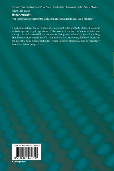 Chapter 1 - State of the art of the development of nanopesticides and their potential benefits.- Chapter 2 - Understanding the interaction of nanopesticides with plants.- Chapter 3 - Study of the interaction of nanopesticides with soil microbiota.- Chapter 4 - Methods for understanding the interaction of nanopesticides with soil and water.- Chapter 5 - State of the art in ecotoxicological assays to study the effects of nanopesticides against non-target organisms.- Chapter 6 - Nanoherbicides.- Chapter 7 - Nanoinsecticides.- Chapter 8 - Nanofungicides.- Chapter 9 - Alternative models for initial screening of nanopesticides safety.- Chapter 10 - Methods for the evaluation toxicological effects of nanopesticides in humans.- Chapter 11 - Use of DNA/RNA and nanotechnology aiming pest control.- Chapter 12 - Regulatory issues regarding Nanopesticides Chapter 13 - Nanopesticides: from the bench to the market.- Chapter 14 - Nanopesticides: risk analysis.