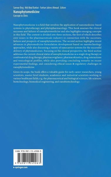 Chapter 1. Nanotechnology Based Phytotherapeutics: Current Status and Challenges.- Chapter 2. Nanophytomedicine Market: Global opportunity analysis and industry forecast.- Chapter 3. Emergence of Nano phytomedicine in health care setting.- Chapter 4. Nanophytomedicine: an effective way for improving drug delivery and bioavailability of herbal medicines.- Chapter 5. Self-Nanoemulsifying Drug Delivery System for Improving Efficacy of Bioactive Phytochemicals.- Chapter 6. Potential of nano-structured drug delivery system for phytomedicine delivery.- Chapter 7. Insights of nanophytomedicines as a combinatorial therapy in disease diagnosis and treatment.- Chapter 8. Pharmacokinetics, interaction, and toxicological profile of nanophytomedicine.- Chapter 9. Recent advancement in clinical application of nanotechnological approached targeted delivery of herbal drugs.- Chapter 10. Nanophytomedicine Ethical issues, Regulatory Aspectsand Challenges.