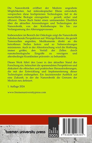 Die Nanorobotik eröffnet der Medizin ungeahnte Möglichkeiten. Auf mikroskopischer Ebene entwickelt, versprechen diese hochpräzisen Technologien, tief in die menschliche Biologie einzugreifen - gezielt, sicher und effizient. Dieses Buch bietet einen umfassenden Überblick über die aktuellen Anwendungen und Technologien der Nanorobotik, von der Krebstherapie bis hin zur Verlangsamung des Alterungsprozesses. Insbesondere im Bereich der Onkologie zeigt die Nanorobotik bahnbrechende Perspektiven auf: Winzige Roboter, die gezielt Tumorzellen angreifen, Medikamente direkt an die betroffenen Stellen liefern und so Nebenwirkungen minimieren. Auch in der Altersforschung wird die Hoffnung immer größer, den Verfall der Zellen durch nanotechnologische Eingriffe zu verzögern und altersbedingte Krankheiten präventiv zu behandeln. Dieses Werk führt den Leser in den aktuellen Stand der Forschung ein, beleuchtet die spannendsten Perspektiven und diskutiert die ethischen und praktischen Herausforderungen, die mit der Entwicklung und Implementierung dieser Technologien einhergehen. Ein faszinierender Ausblick auf eine Zukunft, in der die Nanorobotik die Grenzen der Medizin neu definiert.