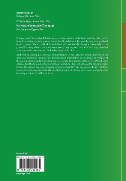 Synapses underlie rapid and flexible neural communication in the brain and they hold the key to understanding higher brain functions in health and disease. Because they are very small and highly dynamic, it is very difficult to study them with traditional techniques. Fortunately, recent ground-breaking advances in optical microscopy (e.g. STED, PALM, STORM, SIM) have greatly improved our ability to image living synapses at the nanoscale, even down to the level of single molecules. The proposed volume brings together leading researchers to review these exciting new techniques and their application in neurobiological research. It will explain and discuss the basic principles behind the various superresolution modalities, how they are implemented, what their scope and limitations are etc. In addition, several key research discoveries on synapses enabled by these novel approaches will be highlighted.