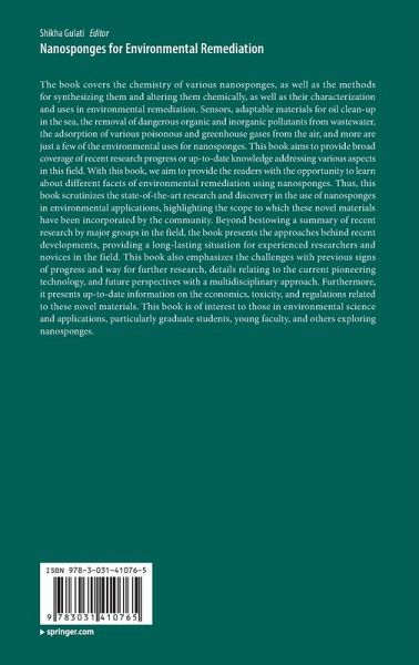 1. Introduction to Nanosponges.- 2. General Synthetic Routesfor Different Types of Nanosponges.- 3. ImportantFunctionalization strategies for Nanosponges.- 4. Characterizationtechniques for Nanosponges.- 5. Different types of Nanosponges used in environmental remediation.- 6. Introduction to Cyclodextrin-Based Nanosponges.- 7. Synthesis, functionalization strategies and application of different types of Cyclodextrin-Based Nanosponges for water treatment.- 8. Introduction to Metal-organic Framework Sponges and their Synthetic and functionalization strategies.- 9. Application of Metal-organic Framework Sponges for toxic or greenhouse Gas Adsorption.- 10. Metal-organic Framework Sponges for Water remediation.- 11. Introduction to Spongelike Functional Materials from TEMPO-Oxidized Cellulose Nanofibers.- 12. Synthesis and application of types of Metal Oxide Nanosponge in water treatment.- 13. Synthesis and Applications of Metal and Metal Oxide-based Nanosponges assensors.- 14. Cellulose-based Nanosponges for the removal of metal ions from wastewater.- 15. Application of nanosponges for aquifer bioremediation.- 16. Nanostructured sponges for the removal of toxic dyes from wastewater.- 17. Environmental application of nanosponges to clean up oil spills.- 18. Polymer-based Nanobiocomposite as a Filter Nanosponge for Wastewater remediation.- 19. Removal of Organic and inorganic Contaminants from Water Using Nanosponge Cyclodextrin Polyurethanes.- 20. Concluding remarks & future perspectives of Nanosponges in environmental remediation.