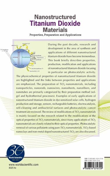 During the past decade, research and development in the area of synthesis and applications of different nanostructured titanium dioxide have become tremendous. This book briefly describes properties, production, modification and applications of nanostructured titanium dioxide focusing in particular on photocatalytic activity. The physicochemical properties of nanostructured titanium dioxide are highlighted and the links between properties and applications are emphasized. The preparation of TiO2 nanomaterials, including nanoparticles, nanorods, nanowires, nanosheets, nanofibers, and nanotubes are primarily categorized by their preparation method (sol-gel and hydrothermal processes). Examples of early applications of nanostructured titanium dioxide in dye-sensitized solar cells, hydrogen production and storage, sensors, rechargeable batteries, electrocatalysis, self-cleaning and antibacterial surfaces and photocatalytic cancer treatment are reviewed. The review of modifications of TiO2 nanomaterials is mainly focused on the research related to the modifications of the optical properties of TiO2 nanomaterials, since many applications of TiO2 nanomaterials are closely related to their optical properties. Photocatalytic removal of various pollutants using pure TiO2 nanomaterials, TiO2-based nanoclays and non-metal doped nanostructured TiO2 are also discussed.