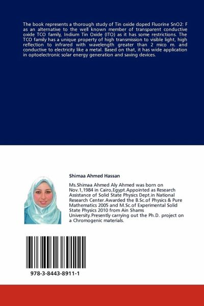 The book represents a thorough study of Tin oxide doped Fluorine SnO2: F as an alternative to the well known member of transparent conductive oxide TCO family, Indium Tin Oxide (ITO) as it has some restrictions. The TCO family has a unique property of high transmission to visible light, high reflection to infrared with wavelength greater than 2 mico m. and conductive to electricity like a metal. Based on that, it has wide application in optoelectronic solar energy generation and saving devices.