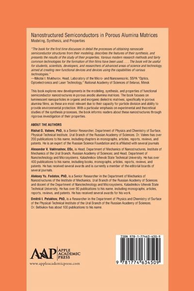 This book, Nanostructured Semiconductors in Porous Alumina Matrices: Modeling, Synthesis, and Properties, explores new developments in the modeling, synthesis, and properties of functional semiconductor nanostructures in porous anodic alumina matrices. The book focuses on luminescent nanoparticles in organic and inorganic dielectric matrixes, specifically in porous alumina films, as these are most relevant due to their capacity for particle division and ability to provide environmental protection. With a particular emphasis on experimental and theoretical studies of the synthesis processes, the book informs readers about these nanostructures through rigorous investigation of their properties. The book, which is divided into ten chapters, begins with a discussion of the existing literature on nanostructural electroluminescent light sources (ELS). This overview establishes a foundation for the remaining nine chapters, which explore in depth many facets of nanostructured materials: their composition, processes they undergo, how they may be implemented, etc. Within these chapters, experimental studies and results are incorporated, in addition to detailed descriptions of simulations that highlight different uses of these materials.