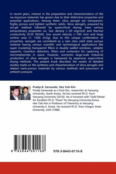 In recent years, interest in the preparation and characterization of the na-noporous materials has grown due to their distinctive properties and potential applications. Among them, silica aerogel are transparent, highly porous and lightest synthetic solids. Silica aerogels, prepared by sol-gel method followed by supercritical drying, have various extraordinary properties viz. low density (~20 mg/cm3) and thermal conductivity (0.05 W/mK), low sound velocity (~100 m/s) and large surface area ( 1500 m2/g). Due to this unique combination of properties, aerogels are considered as a new class solid state porous material having various scientific and technological applications like super insulating transparent fillers in double walled windows, catalytic supports, Cerenkov detectors, filters and containers for capturing of micrometeorites in space. However, economic large-scale industrial production of silica aerogels is hampered by expensive supercritical drying methods. The present book describes the results of detailed studies made on the synthesis and characterization of silica aerogels and related nano-porous materials by various methods and precursors at ambient pressure.