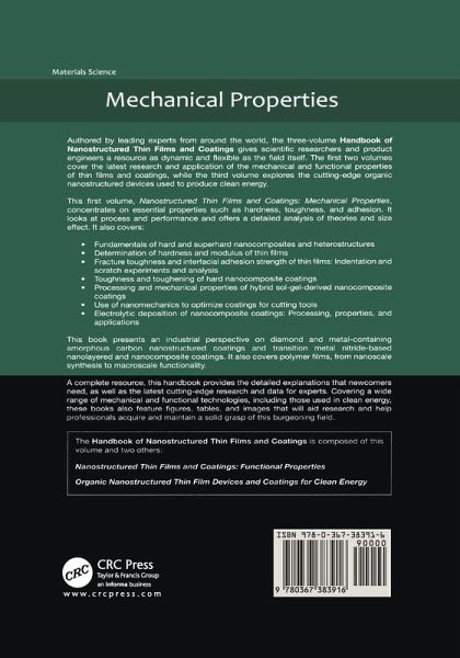The first volume in the Handbook of Nanostructured Thin Films and Coatings set, this book concentrates on the mechanical properties, such as hardness, toughness, and adhesion, of thin films and coatings. It discusses processing, properties, and performance and provides a detailed analysis of theories and size effects. The book presents the fundamentals of hard and superhard nanocomposites and heterostructures, assesses fracture toughness and interfacial adhesion strength of thin films and hard nanocomposite coatings, and covers the processing and mechanical properties of hybrid sol-gel-derived nanocomposite coatings. It also uses nanomechanics to optimize coatings for cutting tools and explores various other coatings, such as diamond, metal-containing amorphous carbon nanostructured, and transition metal nitride-based nanolayered multilayer coatings.