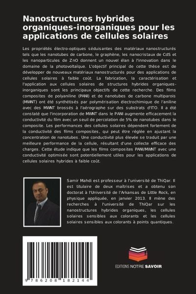 Les propriétés électro-optiques séduisantes des matériaux nanostructurés tels que les nanotubes de carbone, le graphène, les nanocristaux de CdS et les nanoparticules de ZnO donnent un nouvel élan à l'innovation dans le domaine de la photovoltaïque. L'objectif principal de cette thèse est de développer de nouveaux matériaux nanostructurés pour des applications de cellules solaires à faible coût. La fabrication, la caractérisation et l'application aux cellules solaires de structures hybrides organiques-inorganiques sont les principaux objectifs de cette recherche. Des films composites de polyaniline (PANI) et de nanotubes de carbone multiparois (MWNT) ont été synthétisés par polymérisation électrochimique de l'aniline avec des MWNT brossés à l'aérographe sur des substrats d'ITO. Il a été constaté que l'incorporation de MWNT dans le PANI augmente efficacement la conductivité du film avec un seuil de percolation de 5% de nanotubes dans le composite. Les performances des cellules solaires dépendent fortement de la conductivité des films composites, qui peut être réglée en ajustant la concentration de nanotubes. Une conductivité plus élevée se traduit par une meilleure performance de la cellule, résultant d'une collecte efficace des charges. Cette étude indique que les films composites PANI/MWNT avec une conductivité optimisée sont potentiellement utiles pour les applications de cellules solaires hybrides à faible coût.