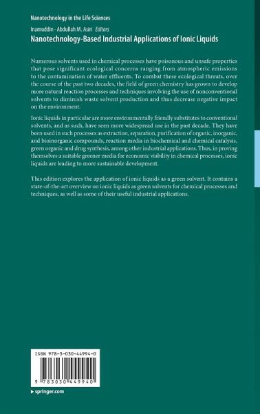 Preface.- Ionic liquids as "green solvents": Are they safe?.- Ionic liquids: Green solvent for biomass pretreatment.- Ionic liquids as solvents and catalysts for biodiesel production.- Biocatalysis in Ionic Liquids: Enzymatic Synthesis of Sugar Fatty Acid Esters.- Ionic Liquid for the Extraction of Plant Phenolics.- Ionic liquids for the Sustainable Development of Chemistry.- Ionic Liquids for Enhanced Enzymatic Saccharification of Cellulose Based Materials.- Biological Applications of Ionic Liquids Based Surfactants: A Review of the Current Scenario.- Ionic Liquid for Water Purification.- Electrical Double-layer Structure of of Ionic Liquids-Electrodes System.- Role of Ionic liquids based multipurpose Gas Hydrate and Corrosion Inhibitors in gas transmission pipeline.- Production of Biodiesel Using Ionic Liquids.- Green Synthesis of Nanoparticles and Their Application for Sustainable Environment.- Recent advances in the application of ionic liquids and deep eutectic solvents for extraction, recovery and dissolution of precious metals and rare earth elements from different matrices.- Applications of ionic liquids in chemical reactions.- Role of Ionic Liquids in Food and Bioproducts Industries.- Index.
