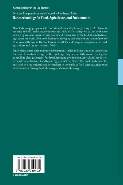 Nanotechnology progresses its concerts and suitability by improving its effectiveness, security and also reducing the impact and risk. Various chapters in this book are written by eminent scientists and prominent researchers in the field of nanotechnology across the world. This book is focused to put emerging techniques forward using nanoparticles for safe and nutritional food production, protecting crops from pests, increasing nutritional value and providing solutions for various environmental issues. The outcome of this book creates a path for wide usage of nanoparticles in food, agriculture and the environment fields. This book has clear and simple illustrations, tables and case studies to understand the content even by non-experts. This book especially deals with the nanotechnology for controlling plant pathogens, food packaging and preservation, agricultural productivity, waste water treatment and bioenergy production. Hence, this book canbe adopted and used by many researchers and academicians in the fields of food, agriculture, environment and nanotechnology for catering the needs of sustainable future. The salient features of this book are - Describes nanotechnology as an interdisciplinary and emerging field in life sciences- Useful for researchers in the cutting edge life science related fields of nanoscience, nanobiology and nanotechnology- Deal with various problems in food, agriculture and environmental sector for sustainable solutions through the application of nanotechnology- Supported with illustrations in color, tables and case studies (wherever applicable), and - Contributed and well written by nanotechnology experts from across various disciplines