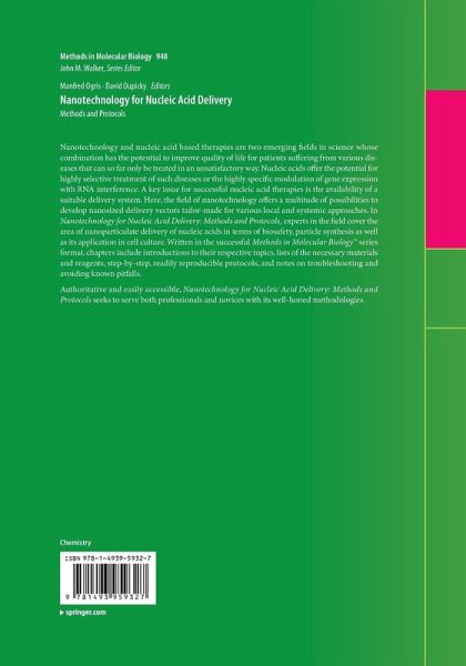 Nanotechnology and nucleic acid based therapies are two emerging fields in science whose combination has the potential to improve quality of life for patients suffering from various diseases that can so far only be treated in an unsatisfactory way. Nucleic acids offer the potential for highly selective treatment of such diseases or the highly specific modulation of gene expression with RNA interference. A key issue for successful nucleic acid therapies is the availability of a suitable delivery system. Here, the field of nanotechnology offers a multitude of possibilities to develop nanosized delivery vectors tailor-made for various local and systemic approaches. In Nanotechnology for Nucleic Acid Delivery: Methods and Protocols, experts in the field cover the area of nanoparticulate delivery of nucleic acids in terms of biosafety, particle synthesis as well as its application in cell culture. Written in the successful Methods in Molecular Biology(TM) series format, chapters include introductions to their respective topics, lists of the necessary materials and reagents, step-by-step, readily reproducible protocols, and notes on troubleshooting and avoiding known pitfalls.