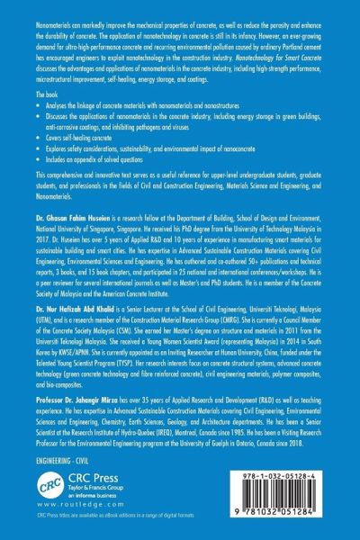 Dr. Ghasan Fahim Huseien is a research fellow at Department of Building, School of Design and Environment, National University of Singapore, Singapore. He received his PhD degree from the University of Technology Malaysia in 2017. Dr. Huseien has over five years of Applied R&D and 10 years of experience in manufacturing smart materials for sustainable building and smart cities. He has expertise in Advanced Sustainable Construction Materials covering Civil Engineering, Environmental Sciences and Engineering, Chemistry, Earth Sciences, Geology, Architecture departments, etc. He authored and co-authored 50+ publications and technical reports, three books and 15 book chapters, and participated in 25 national and international conferences/workshops. He is a peer reviewer for several international journals as well as Master and PhD students. He is a member of the Concrete Society of Malaysia and American Concrete Institute. Professor Dr. Jahangir Mirza has over 35 years of Applied Research and Development (R&D) as well as teaching experience. He has expertise in Advanced Sustainable Construction Materials covering Civil Engineering, Environmental Sciences and Engineering, Chemistry, Earth Sciences, Geology, Architecture departments, etc. He has been a Senior Scientist at the Research Institute of Hydro-Quebec (IREQ), Montreal, Canada since 1985. He has been a Visiting Research Professor for the Environmental Engineering program, at the University of Guelph in Ontario, Canada since 2018. Dr. Nur Hafizah Abd Khalid is a Senior Lecturer at the School of Civil Engineering, Universiti Teknologi, Malaysia (UTM), and is a research member of the Construction Material Research Group (CMRG). She is currently a Council Member of the Concrete Society Malaysia (CSM). She earned her master's degree on structure and materials in 2011 from the Universiti Teknologi Malaysia. She has also been awarded as a Young Women Scientist (representing Malaysia) in 2014 in South Korea by KWSE/APNN. She is currently appointed as an Inviting Researcher at Hunan University, China funded under the Talented Young Scientist Program (TYSP). Her research interests focus on concrete structural, advanced concrete technology (green concrete technology and fiber reinforced concrete), any civil engineering materials, polymer composites, and bio-composites.