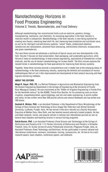 Megh R. Goyal, PhD, PE, is a Retired Professor in Agricultural and Biomedical Engineering from the General Engineering Department in the College of Engineering at the University of Puerto Rico-Mayaguez Campus. He was proclaimed as the "Father of Irrigation Engineering in Puerto Rico for the twentieth century" by the ASABE, Puerto Rico Section, for his pioneering work on micro irrigation, evapotranspiration, agroclimatology, and soil and water engineering. A prolific author and editor, he has written more than 200 journal articles and several textbooks and has edited over 100 books. Santosh K. Mishra, PhD, is an Assistant Professor in the Department of Dairy Microbiology at the College of Dairy Science and Technology at Guru Angad Dev Veterinary and Animal Sciences University, Ludhiana, Punjab, India. He has served in the dairy industry as a Quality Assurance Executive at Mother Dairy, New Delhi, and has handled several externally funded projects. He has published research, review, and popular articles in national and international journals as well as several book chapters and teaching reviews in various training programs. Satish Kumar, PhD, is an Assistant Professor (Food Science and Technology) at the College of Horticulture and Forestry at Dr. Y. S. Parmar University of Horticulture and Forestry in Himachal Pradesh, India. Dr. Kumar served at Lovely Professional University, Phagwara-Punjab, India, as Assistant Professor (Food Technology and Nutrition). He has participated in several national and international conferences, seminars, workshops, training, symposiums, etc. He has to his credit research papers, book chapters, conference papers, and abstracts.