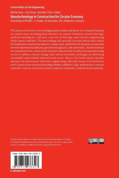 This open access book covers emerging opportunities and future use of nanotechnology in construction, including deep advances in cement chemistry, nanotechnology, artificial intelligence, robotics, concrete technology, and extreme engineering (blast, impact and fire). The proceedings also presents sectorial interactions within the traditional construction industry supply chain, enabled by the dynamic partnership between international industry, government agencies, and universities. Nanotechnology has transformed the construction materials industry into an advanced manufacturing sector to address climate change and carbon neutrality challenges by delivering sustainable and resilient infrastructure assets. Hence, this book reports specific advances in nanoscience and nano-engineering, and their impacts on numerous novel construction materials including binders, additives, high-performance concrete materials, concrete structural systems, polymer composites, and pavement materials.