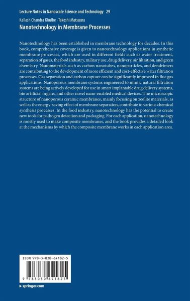Nanotechnology has been established in membrane technology for decades. In this book, comprehensive coverage is given to nanotechnology applications in synthetic membrane processes, which are used in different fields such as water treatment, separation of gases, the food industry, military use, drug delivery, air filtration, and green chemistry. Nanomaterials such as carbon nanotubes, nanoparticles, and dendrimers are contributing to the development of more efficient and cost-effective water filtration processes. Gas separation and carbon capture can be significantly improved in flue gas applications. Nanoporous membrane systems engineered to mimic natural filtration systems are being actively developed for use in smart implantable drug delivery systems, bio artificial organs, and other novel nano-enabled medical devices. The microscopic structure of nanoporous ceramic membranes, mainly focusing on zeolite materials, as well as the energy-saving effect of membrane separation, contribute to various chemical synthesis processes. In the food industry, nanotechnology has the potential to create new tools for pathogen detection and packaging. For each application, nanotechnology is mostly used to make composite membranes, and the book provides a detailed look at the mechanisms by which the composite membrane works in each application area.