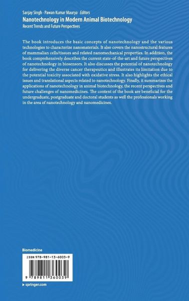The book introduces the basic concepts of nanotechnology and the various technologies to characterize nanomaterials. It also covers the nanostructural features of mammalian cells/tissues and related nanomechanical properties. In addition, the book comprehensively describes the current state-of-the-art and future perspectives of nanotechnology in biosensors. It also discusses the potential of nanotechnology for delivering the diverse cancer therapeutics and illustrates its limitation due to the potential toxicity associated with oxidative stress. It also highlights the ethical issues and translational aspects related to nanotechnology. Finally, it summarizes the applications of nanotechnology in animal biotechnology, the recent perspectives and future challenges of nanomedicines. The content of the book are beneficial for the undergraduate, postgraduate and doctoral students as well the professionals working in the area of nanotechnology and nanomedicines.