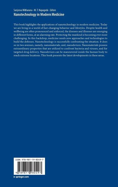 This book highlights the applications of nanotechnology in modern medicine. Today we are living in a world of fast-changing behavior and lifestyles. Despite health and wellbeing are often pronounced and enforced, the diseases and illnesses are emerging in different forms, at an alarming rate. Protecting the mankind is becoming ever more challenging. In this backdrop, medicine needs new approaches and technologies to build the defenses. Nanotechnology is successfully confronting the situation. It does so in two avenues, namely, nanomaterials, and, nanodevices. Nanomaterials possess extraordinary properties that are utilized to confront bacteria and viruses, and for targeted drug delivery. Nanodevices can be maneuvered inside the human body to reach extreme locations. This book presents the latest developments in these areas.