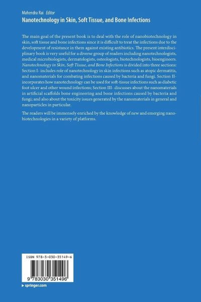 Part 1-Nanotechnology in Skin Infections.- Atopic dermatitis and current trends in pharmacological treatment - a nanoparticulate approach.- Acne vulgaris - recent trends on pharmacological and nanotechnological approaches in therapeutics.- Nitric oxide nanoparticles on skin infections: Current State and Future Prospects.- Metal Nanoparticles Based Antibacterial Nanocomposites for Skin Infections.- Combination therapy using metal nanoparticles for skin infection.- Applications of nanometals in cutaneous infections.- Antifungal nanotherapy: a novel approach to combat superficial fungal infections.- Biocompatible polymers for skin Nanomedicines.- Part 2-Nanotechnology on Soft-Tissue Infections.- Nanotechnological approach to manage diabetic foot ulcer.- Metal nanoparticles in wound infections.- Advances in nanomedicine for burn wound infection treatment.- Applications of chitosan in formulation of novel antibacterial agents and wound dressings.- Polymeric nanocomposites for skin and soft tissues.- Nanoformulations of polyphenols for the treatment of soft tissues infections.- Cutting Edge Nanotechnologies for Targeting Liver Disorders.- NanoCurcumin compounds formulations: Perspectives in skin and soft tissues infections.- Nanobiotechnology strategies for the treatment tegumentary and visceral leishmaniases, and emergence resistance.- Part 3-Nanotechnology in Bone Infections.- Artificial Scaffolds for Bone Tissue Engineering.- The bone biology and the nanotechnology for bone infections and bone engineering.- Part 4-Nanotechnology and Toxicity.- Genotoxicity studies of Silver Nanoparticles in in vivo and in vitro models.