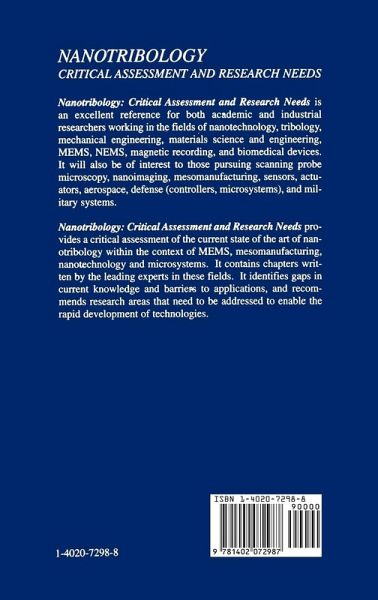 Nanotribology: Critical Assessment and Research Needs is an excellent reference for both academic and industrial researchers working in the fields of nanotechnology, tribology, mechanical engineering, materials science and engineering, MEMS, NEMS, magnetic recording, and biomedical devices. It will also be of interest to those pursuing scanning probe microscopy, nanoimaging, mesomanufacturing, sensors, actuators, aerospace, defense (controllers, microsystems), and military systems.