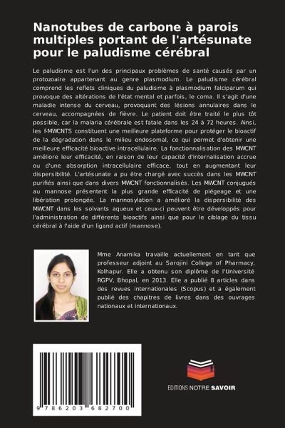Le paludisme est l'un des principaux problèmes de santé causés par un protozoaire appartenant au genre plasmodium. Le paludisme cérébral comprend les reflets cliniques du paludisme à plasmodium falciparum qui provoque des altérations de l'état mental et parfois, le coma. Il s'agit d'une maladie intense du cerveau, provoquant des lésions annulaires dans le cerveau, accompagnées de fièvre. Le patient doit être traité le plus tôt possible, car la malaria cérébrale est fatale dans les 24 à 72 heures. Ainsi, les f-MWCNTS constituent une meilleure plateforme pour protéger le bioactif de la dégradation dans le milieu endosomal, ce qui permet d'obtenir une meilleure efficacité bioactive intracellulaire. La fonctionnalisation des MWCNT améliore leur efficacité, en raison de leur capacité d'internalisation accrue ou d'une absorption intracellulaire efficace, tout en augmentant leur dispersibilité. L'artésunate a pu être chargé avec succès dans les MWCNT purifiés ainsi que dans divers MWCNT fonctionnalisés. Les MWCNT conjugués au mannose présentent la plus grande efficacité de piégeage et une libération prolongée. La mannosylation a amélioré la dispersibilité des MWCNT dans les solvants aqueux et ceux-ci peuvent être développés pour l'administration de différents bioactifs ainsi que pour le ciblage du tissu cérébral à l'aide d'un ligand actif (mannose).