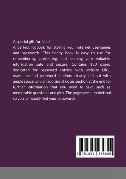 A special gift for Nan! A perfect logbook for storing your internet usernames and passwords. This handy book is easy to use for remembering, protecting, and keeping your valuable information safe and secure. Contains 130 pages dedicated for password entries, with website URL, username and password sections, clearly laid out with ample space, and an additional notes section at the end for further information that you need to save such as memorable questions and pins. The pages are alphabetised so you can easily find your passwords.
