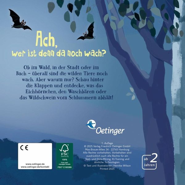 Einschlafrituale leicht gemacht: Ein liebevolles Mitmachbuch mit Klappen und einer gereimten Gute-Nacht-Geschichte für 2 jährige Kinder. Nachtaktive Tiere entdecken: Stabile Klappen mit lustigen Bildern machen das Zubettgehen zu einem spannenden Abenteuer. Tierisch schöne Schlafenszeit: Die humorvolle Umkehrung der klassischen Einschlafgeschichte entführt Kleinkinder spielerisch ins Reich der Träume. Toll ausgestattet: Mit eingängigen Reimen und stimmungsvollen Illustrationen von Lieblingstieren aus Stadt und Wald. Geprüfte Qualität: Das Pappbilderbuch unterliegt strengen Sicherheitsanforderungen und regelmäßigen Kontrollen nach der europäischen Spielzeugsicherheitsrichtlinie.