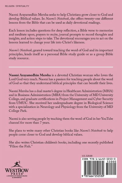 Naomi Arayamedhin Mersha seeks to help Christians grow closer to God and develop Biblical values. In Naomi's Notebook, she offers twenty-one different lessons from the Bible that can be used as daily devotional readings. Each lesson includes questions for deep reflection, a Bible verse to memorize and meditate upon, prayers to recite, journal prompts to record thoughts and insights, and action steps to take. The devotional encourages you to act on the lessons learned to change your life into Christ's likeness. Naomi's Notebook, geared toward teaching the word of God and its important principles, lends itself as a personal Bible study guide or as a group Bible study resource.