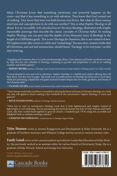 Many Christians know that something mysterious and powerful happens on the cross--and that it has something to do with salvation. They know that God created out of nothing. They know that Jesus was both human and divine. But what do those various doctrines and concepts have to do with one another? This is what Napkin Theology is all about. It is an accessible, rich introduction to Christian theology, illustrated with simple, memorable drawings that describe the classic concepts of Christian belief. In reading Napkin Theology, you can peer into the depths of two thousand years of theology in the length of a CliffsNotes guide. This is not Theology for Dummies; this is not watered-down. We explain terms like creatio ex nihilo and "eschatology," because they contain truths that all Christians, and not just seminarians, should know. Theology is for everyone--so let's start drawing.