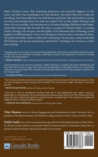 Many Christians know that something mysterious and powerful happens on the cross--and that it has something to do with salvation. They know that God created out of nothing. They know that Jesus was both human and divine. But what do those various doctrines and concepts have to do with one another? This is what Napkin Theology is all about. It is an accessible, rich introduction to Christian theology, illustrated with simple, memorable drawings that describe the classic concepts of Christian belief. In reading Napkin Theology, you can peer into the depths of two thousand years of theology in the length of a CliffsNotes guide. This is not Theology for Dummies; this is not watered-down. We explain terms like creatio ex nihilo and "eschatology," because they contain truths that all Christians, and not just seminarians, should know. Theology is for everyone--so let's start drawing.