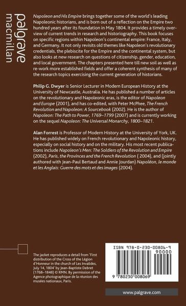 Napoleon and His Empire: Some Issues and Perspectives; P.G.Dwyer & A.Forrest The Plebiscite on the Empire; M.Crook Napoleon as Revolutionary; D.P.Jordan 'Little Emperors?' Investigating Prefectoral Rule in the Departments; G.Daly Power on the Periphery: Elite-State Relations in the Napoleonic Empire; J.Dunne Special Tribunals and the Napoleonic Security State; H.G.Brown Political Prisoners and State Prisons in Napoleonic France; M.Sibalis Revisiting the Continental System: Exploitation to Self-Destruction in the Napoleonic Empire; K.Aaslestad Conscription, Economic Exploitation, and Religion in Napoleonic Germany; U.Planert Education in Napoleonic Italy; A.Grab Divided Destinies: Napoleonic Rule in Northern and Southern Italy; J.A.Davis Defining the Citizen; A.Fahrmeir Napoleon and the 'Modernization' of Germany; M.Rowe