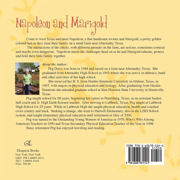 Come to west Texas and meet Napoleon, a fine handsome rooster and Marigold, a pretty golden colored hen as they raise their family on a small farm near Abernathy, Texas. The interactions of the chicks, with different animals on the farm, are serious, sometimes comical and maybe even dangerous. Napoleon meets the challenges head on as he and Marigold educate, protect and hold their little family together. Peg Davis is a fulltime writer after retiring from 35 years of teaching health, physical education and coaching cross country and track in the Lubbock ISD. Ms. Davis' stories are inspired by her childhood of living on a farm and she is currently writing her third book in the series of Napoleon and Marigold's adventures. She lives in Lubbock, Texas and enjoys traveling, reading, sewing and writing. Publisher's website: http://www.strategicbookgroup.com Book Website:http://www.eloquentbooks.com/NapoleonAndMarigold.html