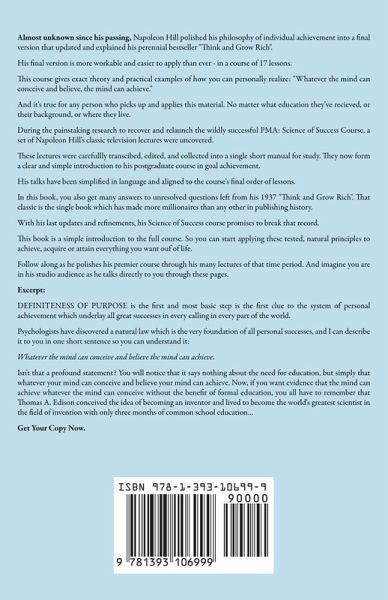 Almost unknown since his passing, Napoleon Hill polished his philosophy of individual achievement into a final version that updated and explained his perennial bestseller "Think and Grow Rich". His final version is more workable and easier to apply than ever - in a course of 17 lessons. This course gives exact theory and practical examples of how you can personally realize: "Whatever the mind can conceive and believe, the mind can achieve." And it's true for any person who picks up and applies this material. No matter what education they've recieved, or their background, or where they live. During the painstaking research to recover and relaunch the wildly successful PMA: Science of Success Course, a set of Napoleon Hill's classic television lectures were uncovered. These lectures were carefullly transcibed, edited, and collected into a single short manual for study. They now form a clear and simple introduction to his postgraduate course in goal achievement. His talks have been simplified in language and aligned to the course's final order of lessons. In this book, you also get many answers to unresolved questions left from his 1937 "Think and Grow Rich". That classic is the single book which has made more millionaires than any other in publishing history. With his last updates and refinements, his Science of Success course promises to break that record. This book is a simple introduction to the full course. So you can start applying these tested, natural principles to achieve, acquire or attain everything you want ouf of life. Follow along as he polishes his premier course through his many lectures of that time period. And imagine you are in his studio audience as he talks directly to you through these pages. Excerpt: DEFINITENESS OF PURPOSE is the first and most basic step is the first clue to the system of personal achievement which underlay all great successes in every calling in every part of the world. Psychologists have discovered a natural law which is the very foundation of all personal successes, and I can describe it to you in one short sentence so you can understand it: Whatever the mind can conceive and believe the mind can achieve. Isn't that a profound statement? You will notice that it says nothing about the need for education, but simply that whatever your mind can conceive and believe your mind can achieve. Now, if you want evidence that the mind can achieve whatever the mind can conceive without the benefit of formal education, you all have to remember that Thomas A. Edison conceived the idea of becoming an inventor and lived to become the world's greatest scientist in the field of invention with only three months of common school education. I was first challenged by Andrew Carnegie to research and document this set of natural principles which makes it possible for you and I and everyone else to write his own price tag in life and attain it. That research and documentation took the rest of my life to this point and was paid for without any grant or outside financing, but through use of the Philosophy itself as it was discovered, tested, and refined. You have in your hands today what is close to a final summation of over 60 years of study and testing. My search led me to the study of the spiritual forces with which all of us are blessed and it was in this field that I came upon a clue which has enabled me to help millions of people to find their earthly destinies. I want to describe my discovery in the simplest terms possible because it will reveal to you how that one statement above is true, regardless of how many times you may have failed in the past or how lofty your aims and hopes may be... Scroll Up and Get Your Copy Now.