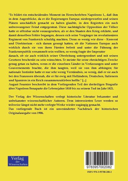 August Fournier beschreibt in dem Vorliegenden Teil der dreiteiligen Biografie über Napoleon Bonaparte die Lebensjahre 1810 bis zu seinem Tod im Jahr 1821.
