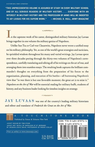 In the capstone work of his career, distinguished military historian Jay Luvaas brings together in one volume the military genius of Napoleon. Unlike Sun Tzu or Carl von Clausewitz, Napoleon never wrote a unified essay on his military philosophy. Yet, as one of the world's great strategists and tacticians, he sprinkled wisdom throughout his many and varied writings. Jay Luvaas spent over three decades poring through the thirty-two volumes of Napoleon's correspondence, carefully translating and editing all of his writings on the art of war, and arranging them into seamless essays. The resulting book captures the brilliant commander's thoughts on everything from the preparation of his forces to the organization, planning, and execution of his battles -- all buttressing Napoleon's view that "in war there is but one favorable moment; the great art is to seize it." Napoleon on the Art of War will be essential reading for military buffs, students of history, and any business leader looking for timeless insights on strategy.