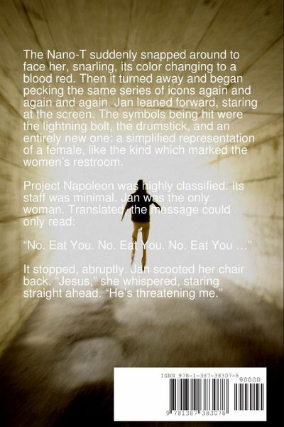 The Nano-T suddenly snapped around to face her, snarling, its color changing to a blood red. Then it turned away and began pecking the same series of icons again and again and again. Jan leaned forward, staring at the screen. The symbols being hit were the lightning bolt, the drumstick, and an entirely new one: a simplified representation of a female, like the kind which marked the women's restroom. Project Napoleon was highly classified. Its staff was minimal. Jan was the only woman. Translated, the message could only read: "No. Eat You. No. Eat You. No. Eat You ..." It stopped, abruptly. Jan…mehr
