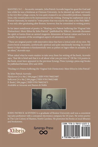 MANTEO, N.C. - An ascetic romantic, John Patrick Acevedo began his quest for God and love while he was a freshman at Clemson University. As he showed up rather nervously to his very first college course, he was quite stunned to see a beautiful professor, Amanda Dyer, who would prove to be instrumental to his writing. During his sophomore year at Boston University, he started to "write poetry that was exactly the same as the Holy Bible." It was only after graduating after Boston, however, that he committed to writing poetry. In his latest installment of poetry in "Healing w/o Patient Suffering (for Virginal Sole Distinction): More Ethos by John Patrick" (published by Xlibris), Acevedo discusses the spirit or karma from an animal magnetic dimension of human nature and how it is actually the passion of the sociological aspects of autonomy and choice. "These are original poetry with innovative ideas that have a lyrical style of my own. My poetry book is romantic, aesthetically spiritual and quite emotionally moving. Its overall theme is that weakness is fundamentally seen as pathos or logos when in actuality, it is an ethos," Acevedo says. When asked what he wants readers to take away from his writing of the book, Acevedo says, "that life is brief and that it is all about what you put into it." Of the 86 poems in the book, most have appeared in the previous Synergy Press (synergy-press.org) books he published between 2012 and 2018. "Healing w/o Patient Suffering (for Virginal Sole Distinction): More Ethos by John Patrick" By John Patrick Acevedo Hardcover 6 x 9in 184 pages ISBN 9781796023497 Softcover 6 x 9in 184 pages ISBN 9781796023480 E-Book 184 pages ISBN 9781796023473 Available at Amazon and Barnes & Noble