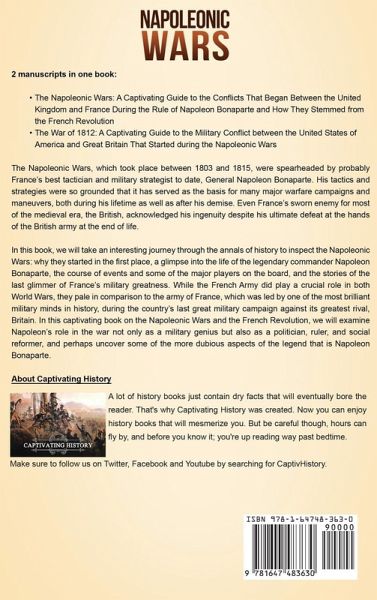 If you want to discover the captivating history of the Napoleonic Wars, then keep reading... Two captivating manuscripts in one book: The Napoleonic Wars: A Captivating Guide to the Conflicts That Began Between the United Kingdom and France During the Rule of Napoleon Bonaparte and How They Stemmed from the French Revolution The War of 1812: A Captivating Guide to the Military Conflict between the United States of America and Great Britain That Started during the Napoleonic Wars The Napoleonic Wars, which took place between 1803 and 1815, were spearheaded by probably France’s best tactician and military strategist to date, General Napoleon Bonaparte. His tactics and strategies were so grounded that it has served as the basis for many major warfare campaigns and maneuvers, both during his lifetime as well as after his demise. Even France’s sworn enemy for most of the medieval era, the British, acknowledged his ingenuity despite his ultimate defeat at the hands of the British army at the end of life. In this book, we will take an interesting journey through the annals of history to inspect the Napoleonic Wars: why they started in the first place, a glimpse into the life of the legendary commander Napoleon Bonaparte, the course of events and some of the major players on the board, and the stories of the last glimmer of France’s military greatness. While the French Army did play a crucial role in both World Wars, they pale in comparison to the army of France, which was led by one of the most brilliant military minds in history, during the country’s last great military campaign against its greatest rival, Britain. In the first part of this captivating book on the Napoleonic Wars, we will examine Napoleon’s role in the war not only as a military genius but also as a politician, ruler, and social reformer, and perhaps uncover some of the more dubious aspects of the legend that is Napoleon Bonaparte. Some of the topics covered in part 1 of this book include: The French Revolution and Post-Revolution France The French Revolutionary Wars: A Divided Europe The Political Rise of Napoleon Bonaparte The Rise of Bonapartism: An Alternative Monarchy Readying for the Napoleonic Wars The Beginning of the Napoleonic Wars The Napoleonic Wars, Part 1 The Napoleonic Wars, Part 2 The French Revolutionary Wars and Napoleonic Wars from a British Socio-Political Perspective What Led to the Fall of Napoleon And much, much more! Some of the topics covered in part 2 of this book include: Prelude to the War Key Players and Statistics of the War of 1812 Timeline of the War of 1812 The War of 1812- The Invasion of Canada The War of 1812- The Taming of the West The War of 1812- The Creek War The War of 1812- Naval Battles of the War of 1812 And much, much more! So if you want to learn more about The Napoleonic Wars and The War of 1812, scroll up and click the "add to cart" button!