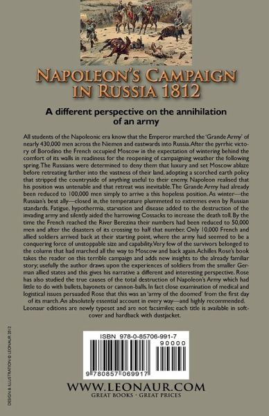 A different perspective on the annihilation of an army All students of the Napoleonic era know that the Emperor marched the 'Grande Army' of nearly 430,000 men across the Niemen and eastwards into Russia. After the pyrrhic victory of Borodino the French occupied Moscow in the expectation of wintering behind the comfort of its walls in readiness for the reopening of campaigning weather the following spring. The Russians were determined to deny them that luxury and set Moscow ablaze before retreating farther into the vastness of their land, adopting a scorched earth policy that stripped the countryside of anything useful to their enemy. Napoleon realised that his position was untenable and that retreat was inevitable. The Grande Army had already been reduced to 100,000 men simply to arrive a this hopeless position. As winter-the Russian's best ally-closed in, the temperature plummeted to extremes even by Russian standards. Fatigue, hypothermia, starvation and disease added to the destruction of the invading army and silently aided the harrowing Cossacks to increase the death toll. By the time the French reached the River Berezina their numbers had been reduced to 50,000 men and after the disasters of its crossing to half that number. Only 10,000 French and allied soldiers arrived back at their starting point, where the army had seemed to be a conquering force of unstoppable size and capability. Very few of the survivors belonged to the column that had marched all the way to Moscow and back again. Achilles Rose's book takes the reader on this terrible campaign and adds new insights to the already familiar story; usefully the author draws upon the experiences of soldiers from the smaller German allied states and this gives his narrative a different and interesting perspective. Rose has also studied the true causes of the total destruction of Napoleon's Army which had little to do with bullets, bayonets or cannon-balls. In fact close examination of medical and logistical issues persuaded Rose that this was an 'army of the doomed' from the first day of its march. An absolutely essential account in every way-and highly recommended. Leonaur editions are newly typeset and are not facsimiles; each title is available in softcover and hardback with dustjacket.